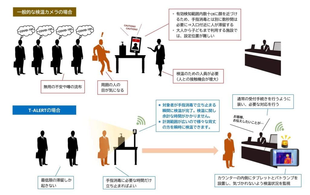 私どもが独自開発した「T-ALERT」は、検温場所と離れた場所にある受付カウンターなどで検温の状況を監視できる、ホテルや会員制施設などでのスクリーニングに適したサーマルカメラシステムです。